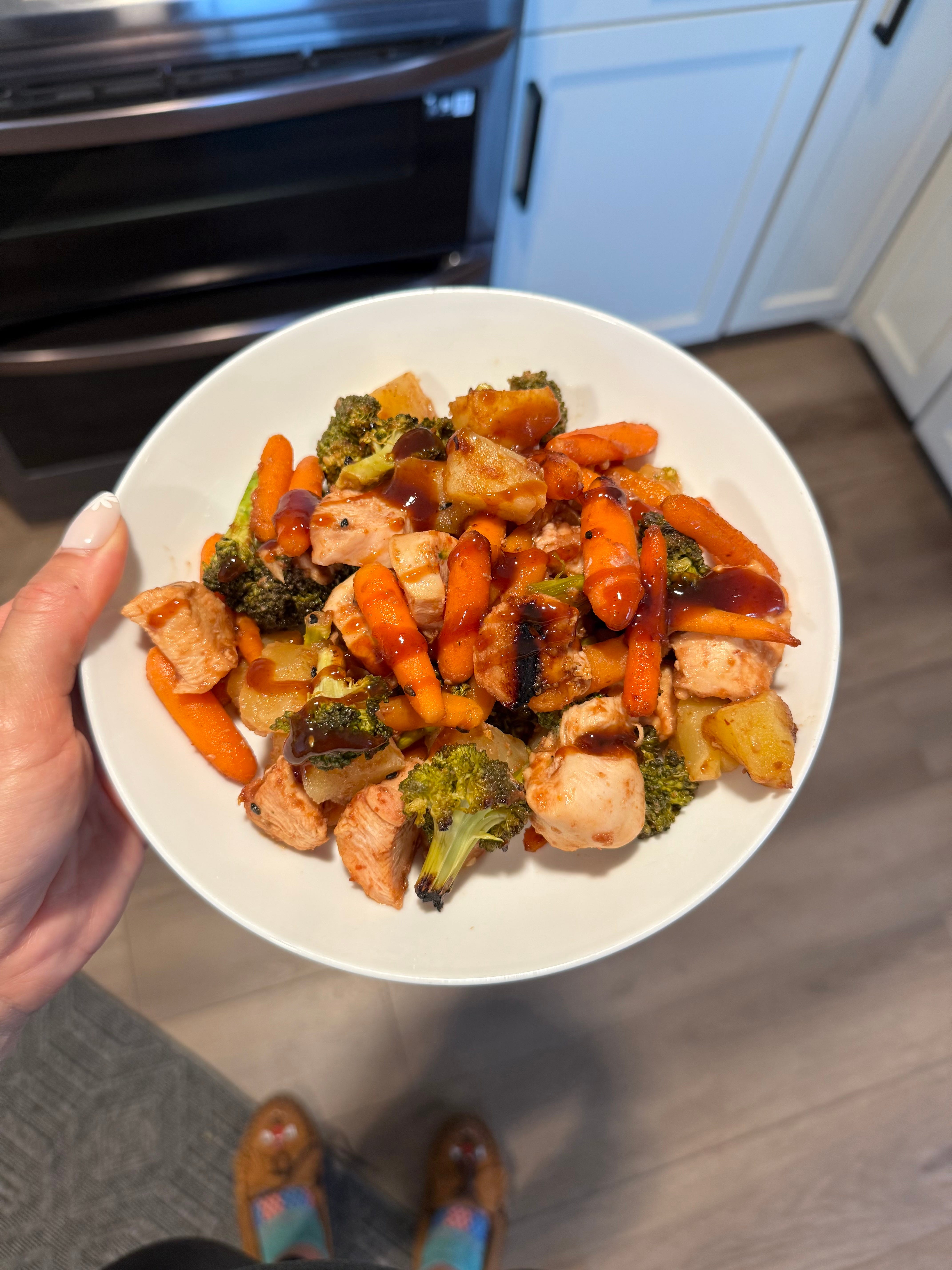 The pineapple and BBQ flavors of this meal pair nicely with the warm veggie mix. It’s a breeze to prep, with veggie and chicken chopping taking the most effort.